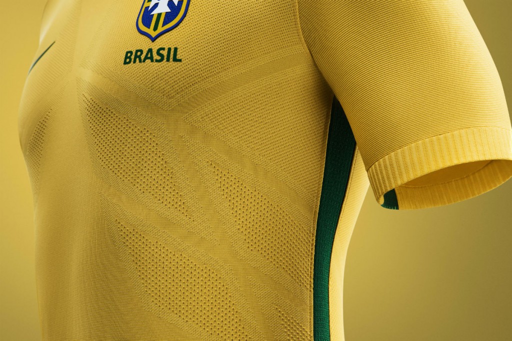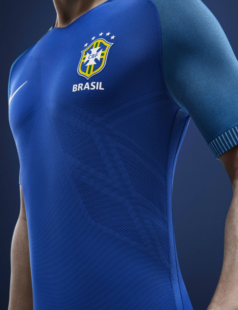 BRASILE (Nike). Il nuovo template Nike AeroSwift caratterizza le divise del Brasile, i cui colori sono il classico giallo con dettagli verdi e l’altrettanto tradizionale blu. Sia all’interno sia all’esterno delle maglie compaiono riferimenti che elogiano l’orgoglio nazionale. Lo stemma della Federazione è stampato a caldo sul petto e circondato dalle cinque stelle che celebrano i pentacampeones. La parola Brasil appare al di sotto dello stemma ed è ricamata anche nella parte posteriore del collo. Amor e Orgulho sono le parole che ornano l’interno dei polsini mentre l’interno del corpo rivela l’iconico diamante della bandiera brasiliana circondato dal motto Nascido Para Jogar Futebol (Nato per giocare a calcio). Piccola curiosità: accanto ai tradizionali pantaloncini blu, già “bannati” dalla FIFA negli ultimi mondiali, saranno disponibili dei calzoncini gialli. La divisa away del Brasile per la Copa America 2016 è realizzata in un colore blu vivace, con un pannello posteriore superiore e maniche contrastanti in blu chiaro, realizzato dall’incrocio del blu col bianco. La divisa offre poi la scelta di pantaloncini bianchi oppure della classica opzione in abbinamento blu.