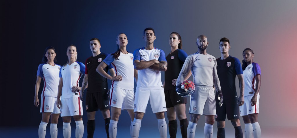 USA (Nike). Gli Stati Uniti portano in campo i modernissimi kit AeroSwift di Nike, gli stessi assegnati al Brasile e ai top team di Euro 2016. La maglia home ha il corpo bianco e le maniche blu. Sul petto della maglia ritroviamo le aree lavorate a maglia tecnica tipiche della nuova collezione Vapor AeroSwift. Sulla costina posteriore del collo della maglia è ricamata la parola USA, mentre all’interno dei polsini delle maniche sono state ricamate le scritte 1 Team e 1 Nation, slogan già in uso a Brasile 2014. La divisa da trasferta ha il corpo nero lucido, con le maniche rossa a destra e blu a sinistra, richiamo evidente ai colori della patria. Neri sono anche i pantaloncini e le calze, completate da una striscia colorata abbinata alla manica sul polpaccio.