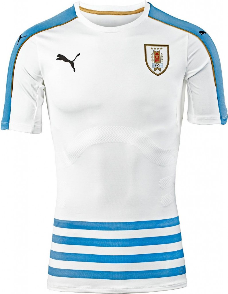 URUGUAY (Puma). La divisa di casa della Celeste si contraddistingue per il template caratteristico sul quale è stata lavorata l’immagine del Sol de Mayo, combinato con piccole strisce orizzontali, elemento caratteristico della bandiera nazionale. Le spalle sono percorse da due fasce nere, stesso colore utilizzato per il logo del brand sul petto. I dettagli del logo sono oro, come l’interno del colletto al di sotto del quale si intravede una targa con il soprannome dedicato alla nazionale uruguaiana (La Celeste, appunto). Completano la divisa i pantaloncini neri con fasce celesti sui fianchi e calzettoni neri, con orlo celeste. Quella da trasferta è bianca, con colletto rotondo dal quale partono due fasce azzurre bordate d’oro fino alla fine delle maniche. Sulla parte bassa della maglia, Puma ha voluto omaggiare la bandiera nazionale con quattro righe celesti poste orizzontalmente. I dettagli all’interno del colletto sono gli stessi che caratterizzano la divisa home; pantaloncini e calzettoni bianchi, bordati di celeste.