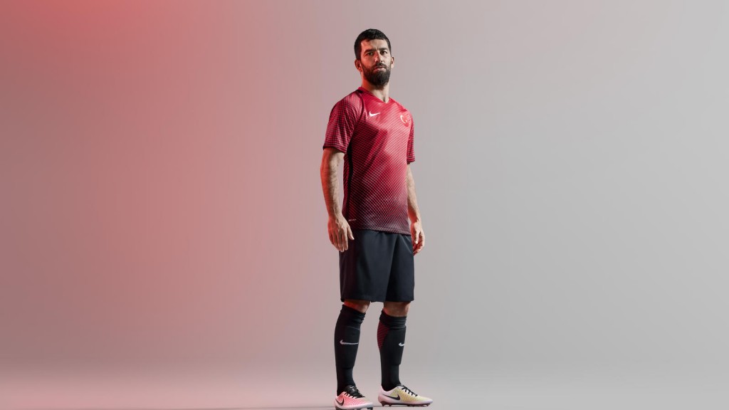 TURCHIA (NIKE) – La nuova divisa della Turchia è un vero e proprio inedito ed esalta il coraggio dei designer di Nike, facendo sicuramente parlare di sè. Sulla maglia di casa è presente un motivo micro-geometrico a rombi, ispirato ai mosaici bizantini; il disegno della maglia fa sì che il colore vada a sfumare dal nero della base della maglia al rosso vivo del petto e delle spalle. Lo stemma sul petto è rosso, con la classica mezzaluna e la stella bianche, calzettoni e pantaloncini sono neri. Identica la divisa da trasferta, che però è realizzata in turchese e bianco brillante, con dettagli rossi, pantaloncini turchesi e calzettoni rossi.