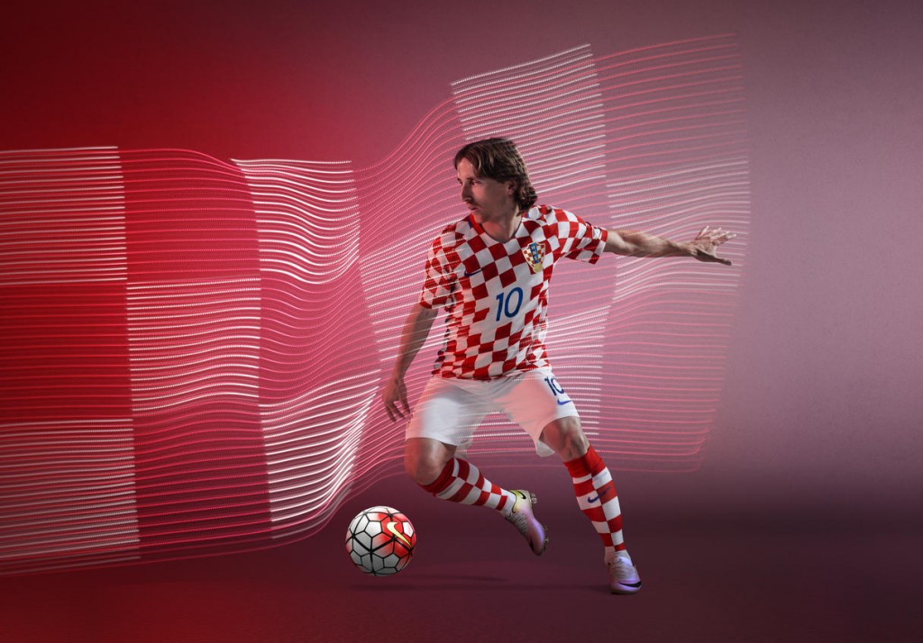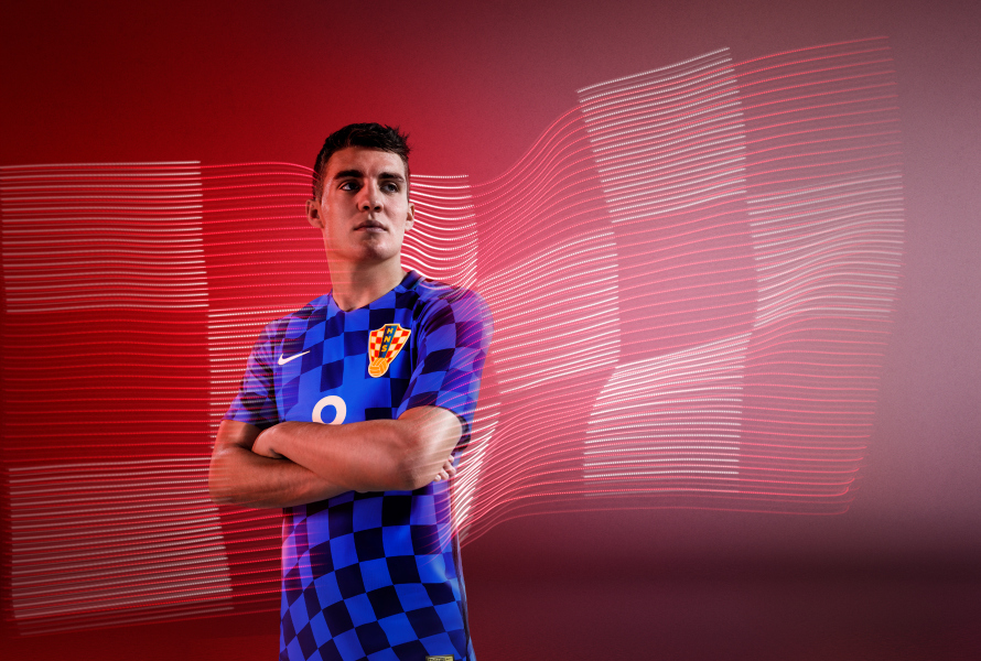 CROAZIA (NIKE). Sulle divise della Croazia non potevano non trovare spazio i classici scacchi, simbolo nazionale da oltre 500 anni e inconfondibili anche in ambito calcistico. Stavolta non sono sistemati in maniera geometrica, ma danno un piacevole senso di movimento, ricordando lo sventolìo della bandiera; una soluzione che richiama agli appassionati quella vista durante i gloriosi mondiali del 1998. I dettagli della maglia sono blu, i pantaloncini bianchi, le calze di nuovo a scacchi biancorossi. Il motivo a scacchi trova spazio anche sulla divisa away, realizzato in due tonalità di blu. Blu anche pantaloncini e calze, unici dettagli di colore diverso il bianco dello Swoosh Nike (e del numero) e il motivo a righine orizzontali sul polpaccio.