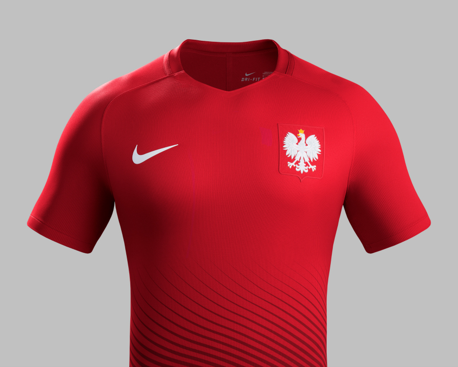 POLONIA (NIKE). Realizzati con la più consueta tecnologia Dri-Fit, i due completi Nike della Polonia di Robert Lewandowski sono molto classici e riprendono i colori della bandiera. La maglia home è bianca, con stemma sul petto e piccoli dettagli rossi sulla parte esterna del colletto. Sul corpo della casacca, un motivo stilizzato ad ala omaggia ulteriormente l’aquila polacca, mentre la scritta Polska compare sul retro del collo. La striscia verticale sui lati della maglia è rossa e prosegue sui pantaloncini, rossi anche essi. I calzettoni sono bianchi, con un motivo a righe orizzontali sul polpaccio. La divisa da trasferta è identica nei particolari, ma realizzata interamente in rosso con dettagli bianchi.