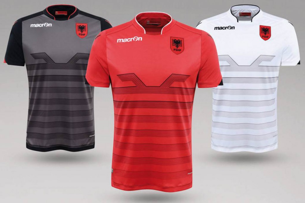 ALBANIA (MACRON). Primo contratto di sponsorizzazione con una nazionale per la bolognese Macron, che fino al 2021 vestirà l’Albania di Gianni De Biasi. Le maglie sono caratterizzate da un disegno minimal ma molto accattivante, che ritrae l’aquila a due teste stilizzata, tono su tono e colletto alla coreana. La prima casacca è rossa con pantaloncini neri e calzettoni rossi. La seconda e la terza sono rispettivamente total white e total black.