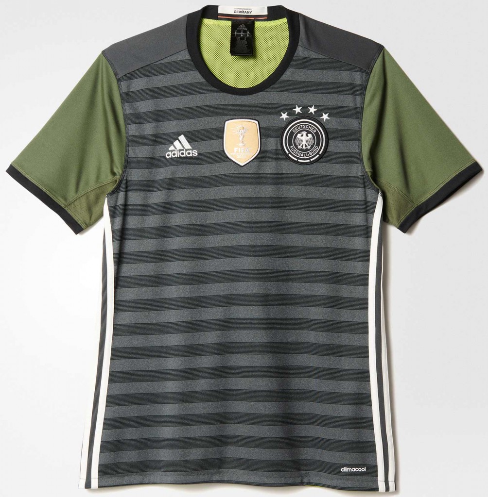 GERMANIA (ADIDAS). Presentata attraverso un evento speciale a Berlino, la maglia dei Campioni del Mondo realizzata da adidas rispecchia fedelmente la storia della federazione tedesca. Bianca nella quasi totalità, con dettagli neri, tra i quali le 3 strisce che non saranno più sulle spalle, bensì sui fianchi. Sulla parte frontale, oltre alla patch celebrativa World Champions 2014, si nota una sorta di codice a barre verticale, che indica i titoli mondiali ed europei ottenuti dalla Germania. Il secondo completo è un’autentica novità, innanzitutto per i colori nero, grigio e verde, inseriti in un template a righe orizzontali, poi per la caratteristica scelta di realizzare una maglia reversibile. Il lato nascosto della casacca è interamente verde fluo.
