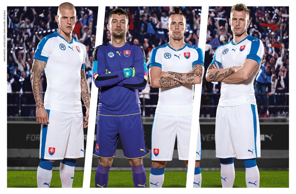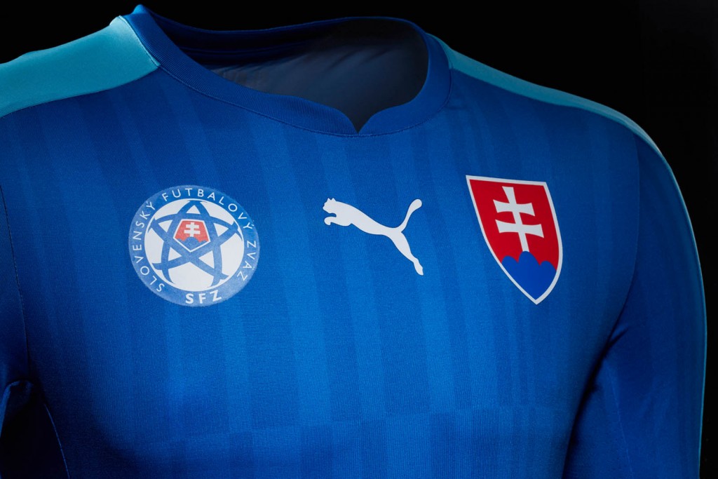 SLOVACCHIA (PUMA). Completi dal design sobrio e lineare per la Slovacchia, prodotti da Puma. La prima divisa sarà bianca, con decorazioni blu presenti principalmente sulle spalle, fino all’orlo delle maniche, e sul girocollo, che termina leggermente a V. La seconda maglia adotta un template simile, ma possiamo notare due importanti differenze: il disegno sul busto a linee verticali ad intervalli irregolari e l’uso del colore azzurro nei dettagli, anziché il classico bianco.
