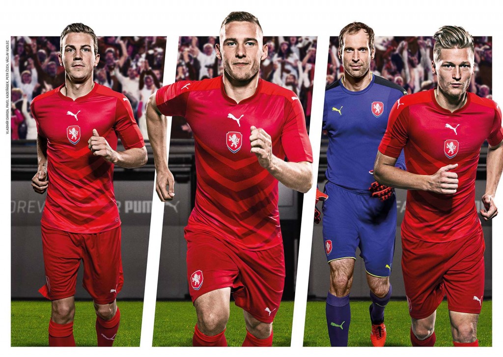 REPUBBLICA CECA (PUMA). Anche quest’anno la partnership duratura tra Puma e Repubblica Ceca ha messo a punto delle maglie moderne ed esteticamente piacevoli. La maglia Home è interamente rossa, con la presenza di diverse tonalità dello stesso colore principalmente sulle fasce che percorrono entrambe le spalle e le linee che si allargano a V, verso il fondo della casacca. La seconda divisa è invece bianca, con due fasce blu royal sulle spalle, stesso colore dell’orlo fine sul colletto.