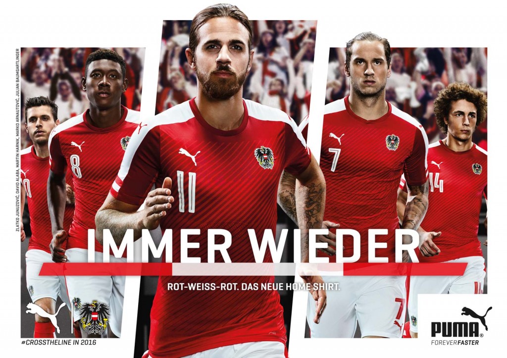 AUSTRIA (PUMA). Le ultime divise Puma per Euro 2016 sono quelle dell’Austria. La nuova maglia di casa è caratterizzata da un disegno semplice, sulla base dei template più ricorrenti del marchio tedesco, con un motivo a strisce sottili diagonali, che percorrono diverse tonalità di rosso. Le fasce sulle spalle sono bianche e terminano con la bandiera austriaca sull’orlo, mentre il colletto è rotondo, sovrapposto sulla parte anteriore. La maglia da trasferta di Alaba e compagni è invece interamente bianca, con colletto a V nero, così come le bande che percorrono le maniche. Una divisa candida, ma allo stesso tempo accattivante.