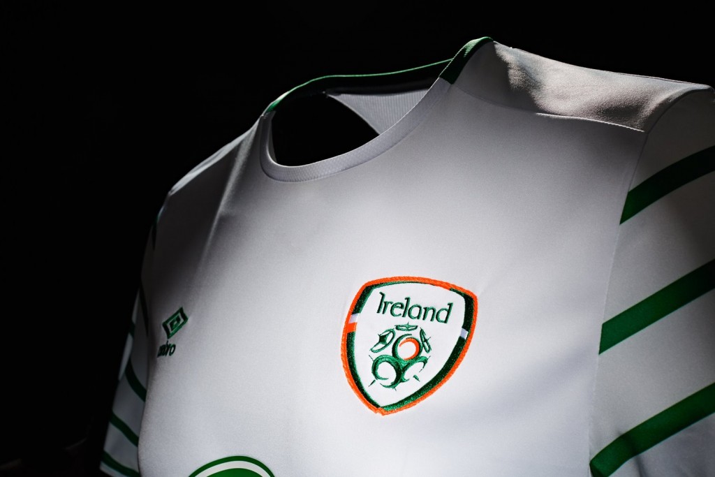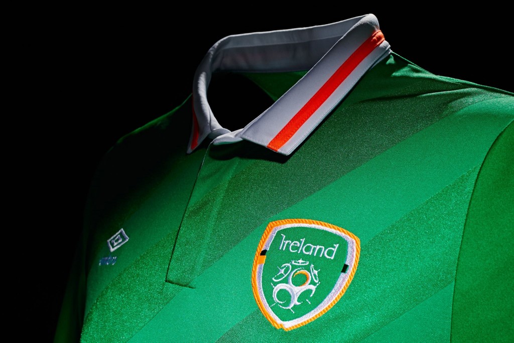 IRLANDA (UMBRO). Seguendo lo stile che la contraddistingue, l’inglese Umbro ha prodotto per la Repubblica D’Irlanda delle maglie dal design classico, molto fedeli ai colori della bandiera nazionale. Il verde domina sull’intera casacca, sulla quale si percepisce un motivo a fasce diagonali di tonalità leggermente diversa. Il colletto a polo è bianco e arancione, chiuso centralmente da due bottoni coperti. Il bianco e l’arancione sono i colori che rifiniscono anche entrambi i lati della divisa. All’interno del colletto sono stampate le coordinate della capitale Dublino, accompagnate da una decorazione gaelica. Il kit away non è altrettanto tradizionale, ma comunque interessante grazie al template gaelico nella parte superiore della maglia, grigio e nero, diviso dal resto del busto da una sottile linea orizzontale verde fluo. Le maniche sono bianche, come l’orlo del colletto.