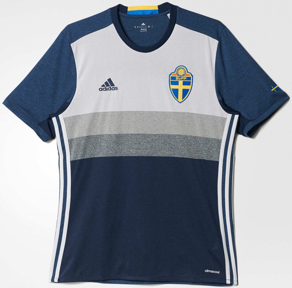SVEZIA (ADIDAS). La nazionale capitanata da Zlatan Ibrahimovic è ormai considerata da anni uno dei top team sponsorizzati da Adidas, lo dimostrano le maglie prodotte per questa competizione continentale, che riprendono tutte le novità dei kit del brand tedesco. Le strisce blu royal sui fianchi, infatti, rifiniscono il predominante giallo della casacca home, dettagliato inoltre dal girocollo e dagli orli delle maniche, sempre in blu. Il completo da trasferta è principalmente blu (maniche e metà busto), che sfuma verso il bianco della parte superiore passando per due fasce orizzontali di diverse tonalità di grigio. Le stripes Adidas sui fianchi sono bianche.