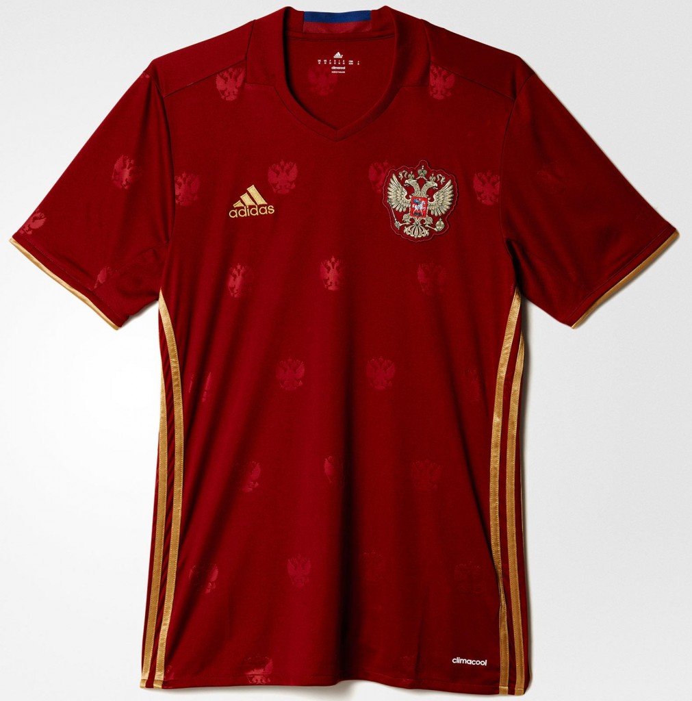 RUSSIA (ADIDAS). Adidas e la Federazione Russa realizzano anche per i prossimi Europei una divisa casalinga granata, o per meglio dire borgogna, come nell’ultima edizione dei mondiali brasiliani. Questa volta, però, i dettagli non sono arricchiti solamente dalla presenza del colore oro, ma anche dallo sfondo decorato con le aquile, simbolo proprio della federazione, rappresentanti la libertà, il coraggio e la solidarietà. Il secondo completo è invece bianco, dettagliato di rosso. Sul petto ritroviamo nuovamente il simbolo della RFS, in tonalità grigia.