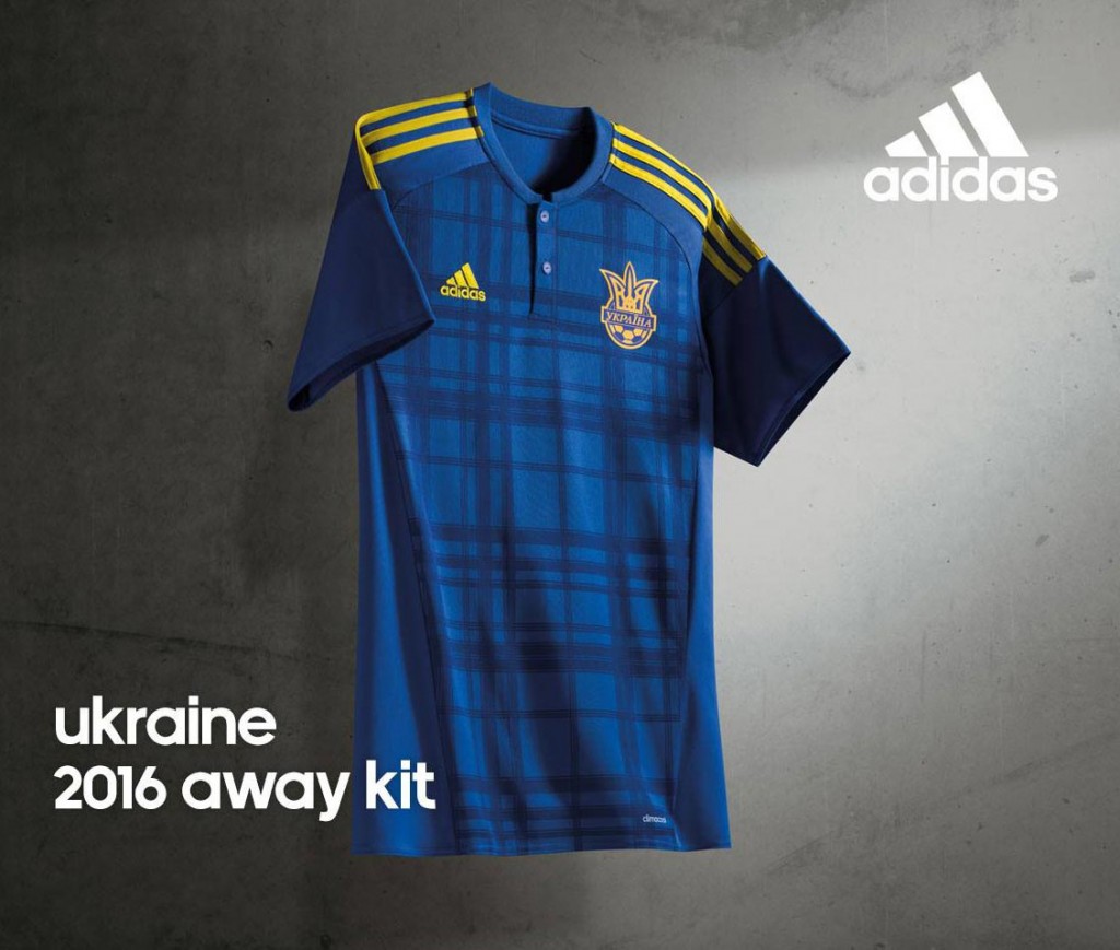 UCRAINA (ADIDAS). Presentate in grande stile con la partecipazione di diversi personaggi popolari e freestylers professionisti, le divise della nazionale Ucraina si rinnovano mantenendo i colori tradizionali. Prima maglia gialla sulla quale si nota un motivo a quadri tono su tono nella parte frontale, colletto dello stesso colore chiuso da due bottoni e strisce Adidas blu royal sulle spalle. La seconda divisa mantiene lo stesso stile e gli stessi dettagli, ma a colori invertiti.