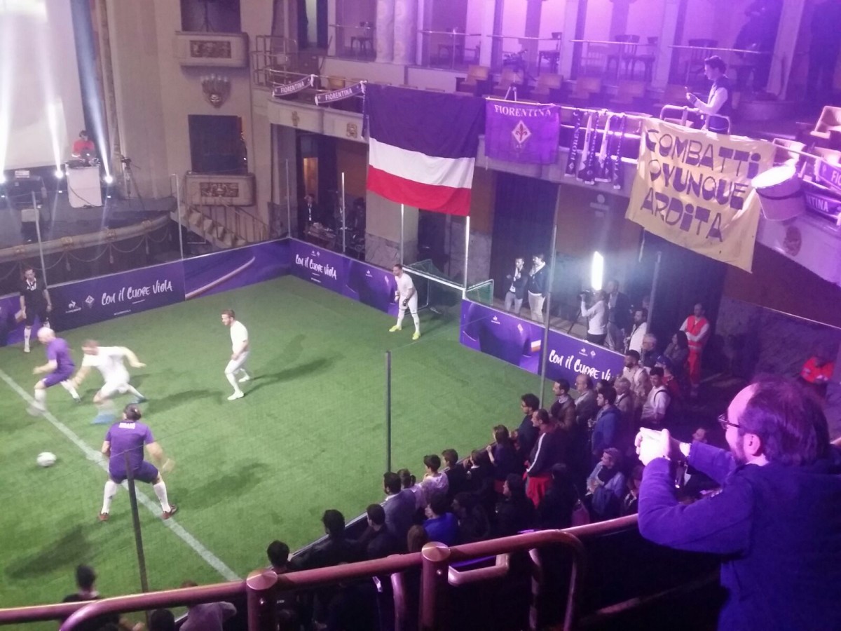L’interno del cinema, privato di tutte le poltrone, ha ospitato una gabbia da calcetto per un torneo 4 vs 4: a sfidarsi un team di blogger, due squadre formate da tifosi viola estratti a sorte dagli abbonati all’ultima stagione e una squadra di ex viola, guidati dal bomber Christian Riganò (57 gol in 94 presenze con la maglia gigliata e, soprattutto, vero protagonista della risalita dalla C2) e da Alberto Di Chiara (5 dei suo 17 anni di onorata carriera in Seria A trascorsi lungo l’Arno).  Come tutti potrete immaginare è stato proprio quest’ultimo team ad aggiudicarsi il torneo, anche per una certa “resistenza” delle squadre dei tifosi viola a fare contrasti e scivolate contro i loro idoli!