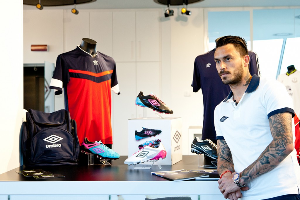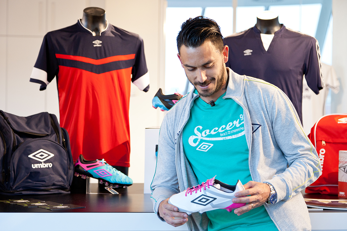 Incontriamo Mauricio Pinilla nella sede centrale di Umbro Italia a Brescia, in un bel palazzo moderno che ci accoglie con un prato sintetico come moquette. Pinilla arriva trafelato dopo uno degli ultimi allenamenti dell’anno con l’Atalanta. È stanco, ma per noi fa uno sforzo e non si nega a uno shooting fotografico con la palla e le sue Umbro Velocita ai piedi. Tra battute sul pallone un po’ sgonfio e il vento che tira troppo forte, rientriamo e inizia l’intervista.