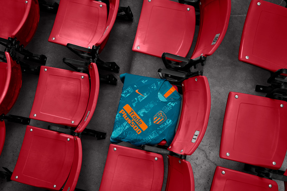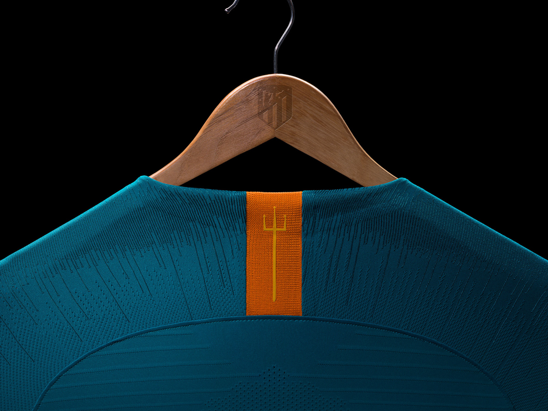 Ispirata stilisticamente alla casacca home a strisce verticali, la nuova terza maglia dei Colchoneros è una combinazione inusuale di colori: blu scuro, azzurro ghiaccio e arancione. Quest’ultimo tinge anche il crest, per l’occasione monocromatico.