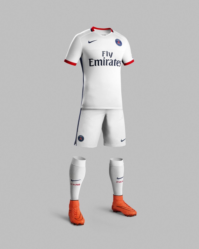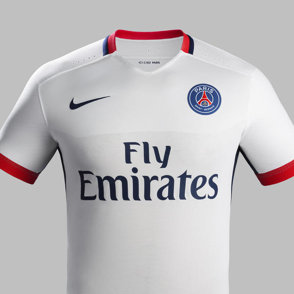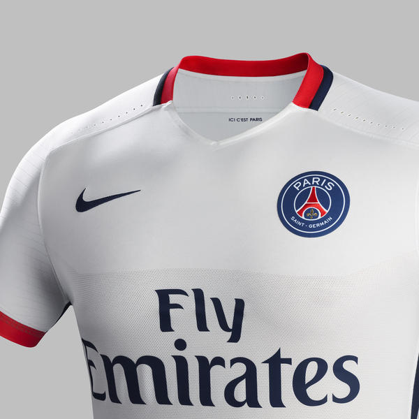 Nella inconfondibile cornice della Grande Mela, Nike ha presentato la maglia away del Paris Saint-Germain per la stagione 2015/16, disegnata con l’eleganza che contraddistingue la città di Parigi e il suo stile iconico. Il completo è interamente bianco, contrastato dai dettagli rossi e blu, ispirati dai colori sociali, dominanti invece sulla maglia di casa. La maglia ha la sua più importante particolarità sulle maniche, dove sono state inserite delle pinstripes tono su tono, proprio per accentuare il ruolo di Parigi come capitale della moda.