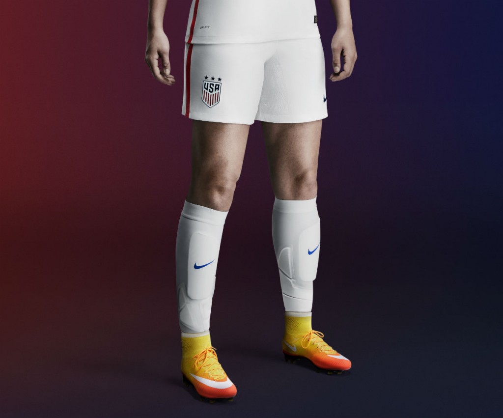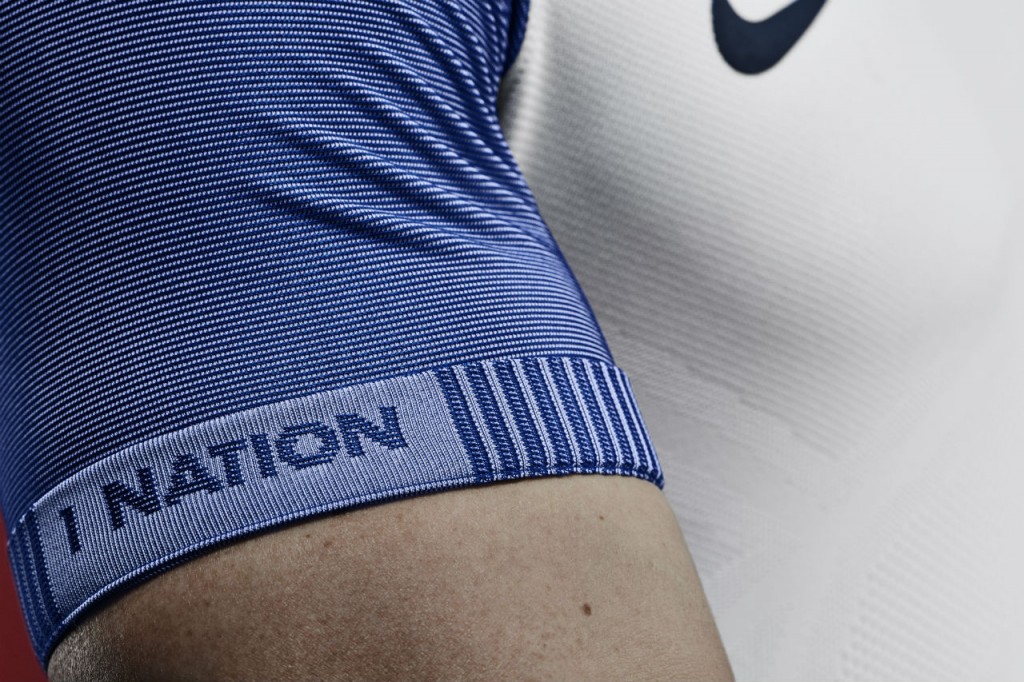 All’interno delle maglie – inoltre – dietro allo stemma stampato a caldo (qui la nostra analisi del nuovo logo US Soccer) si trova una scritta composta dalla parola USA, circondata dalla frase “We can, we will, we are one nation, one team”, ispirata al tweet di un tifoso prima della partita contro il Ghana durante gli ottavi di Brasile 2014. I lati di tutte e due le divise riportano una riga rossa che corre dall’ascella fino alla fine dei pantaloncini che è in grado di espandersi quando il calciatore è in movimento, garantendogli il massimo della ventilazione. Le nuove calze con gambale a compressione sono bianche con una linea blu sul retro del polpaccio. La particolarità sta nell’inserimento di rinforzi sulle caviglie e di cuscinetti di protezione attorno all’area coperta dal parastinco. A proposito di parastinchi: l’estrema aderenza della calza e un piccolo strap elasticizzato sotto il ginocchio permettono di mantenere la protezione ben fissa sulla zona tibiale, senza correre il rischio che si sposti durante il match.