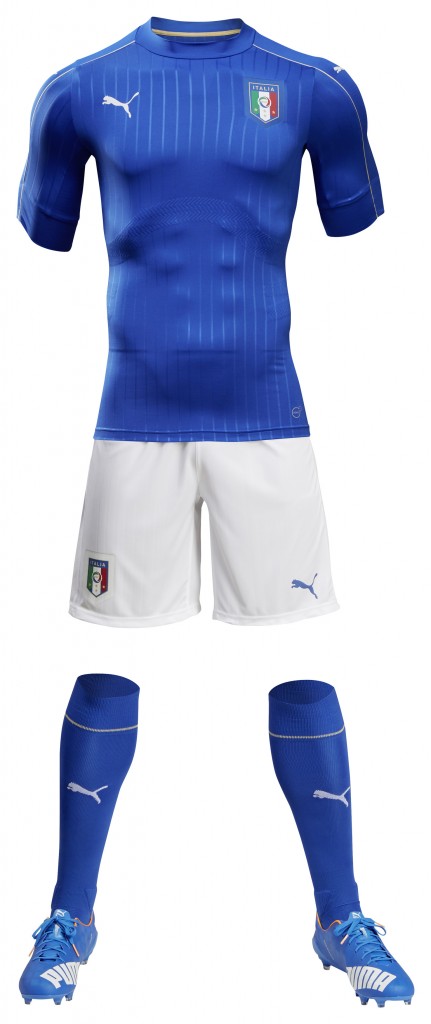 Il completo di casa che verrà usato a Euro 2016 (e per la prima volta venerdì 13 a Bruxelles contro il Belgio) è classico, azzurro e bianco e si ispira ai trionfi del passato. Il design, oltre che alla storia del calcio italiano, trae ispirazione dalla tradizione della moda sartoriale italiana. Fra le caratteristiche spiccano il colletto alto, riferimento alle più famose maglie del passato, e le sottili linee verticali stile “gessato” in rilievo lungo su fronte, maniche e schiena. Da notare anche gli inserti in mesh lungo le spalle, i polsini delle maniche ampi e i dettagli in oro sulle maniche e i particolari tricolore sugli orli. La maglia azzurra si abbina (finalmente!) a pantaloncini bianchi e calzettoni azzurri.