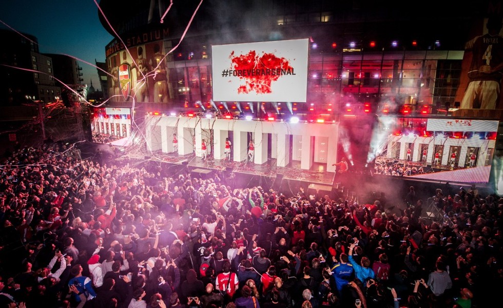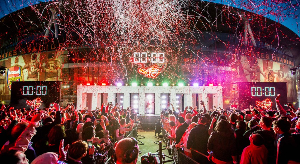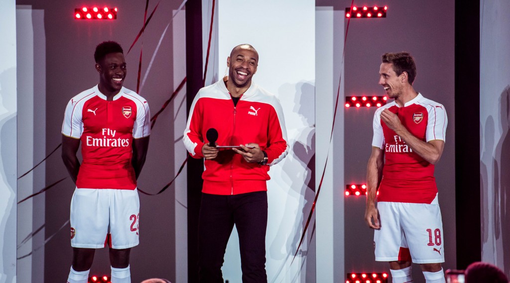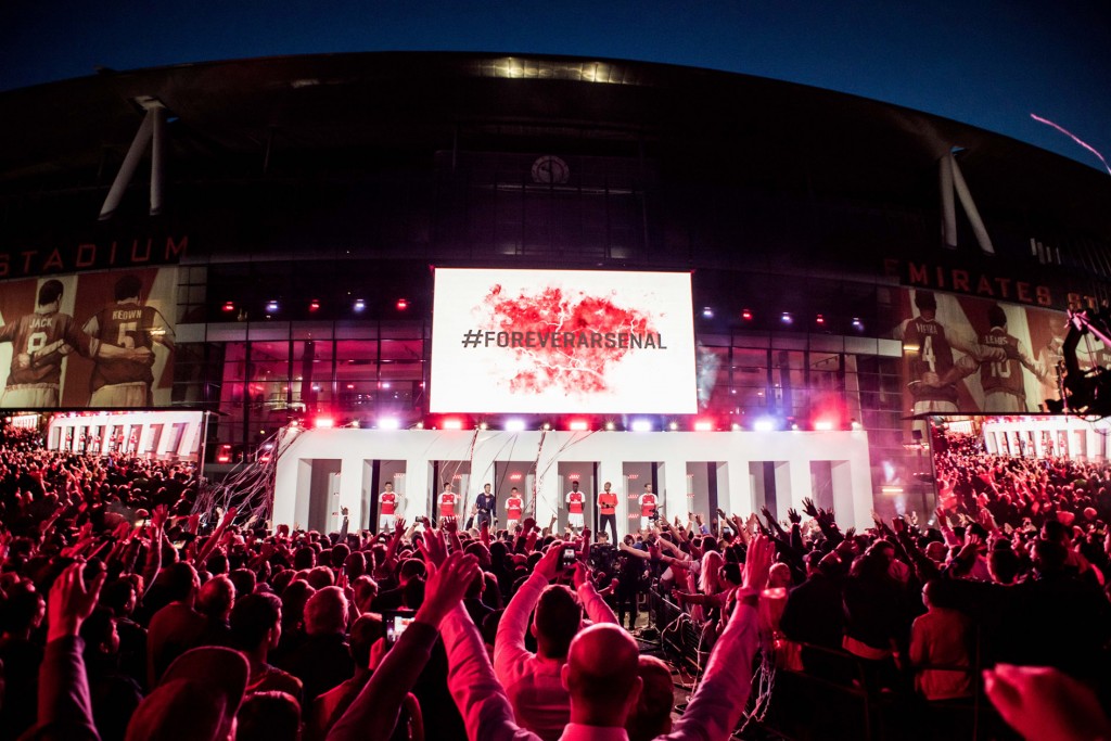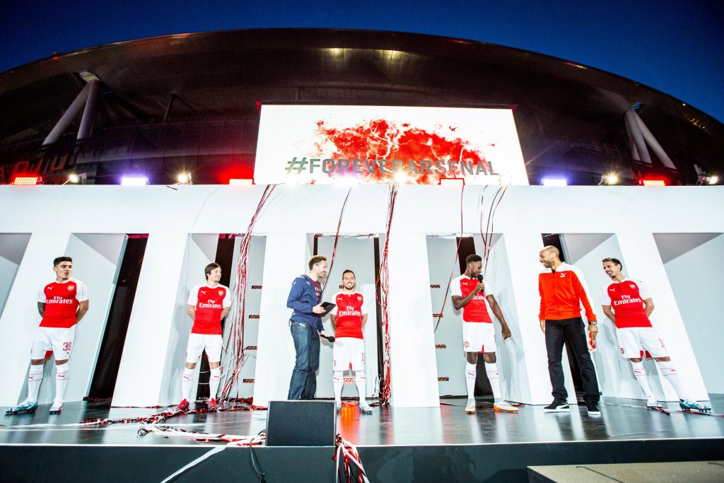 Una volta terminato il countdown, sono apparsi sul palco i giocatori attuali: Santi Cazorla, Hector Bellerín, Tomás Rosicky, Nacho Monreal e Danny Welbeck indossavano il nuovo Home Kit dell’Arsenal.