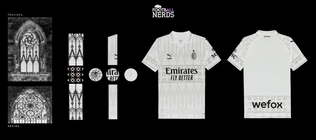 Nel caso di questa speciale maglia Milan PLEASURES x Puma, le reference sono state elaborate ed estrapolate del contesto per diventare un decorazione nuova, ma allusiva e assonante all’aspetto del monumento reference: il Duomo.