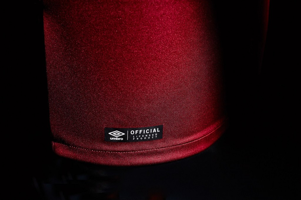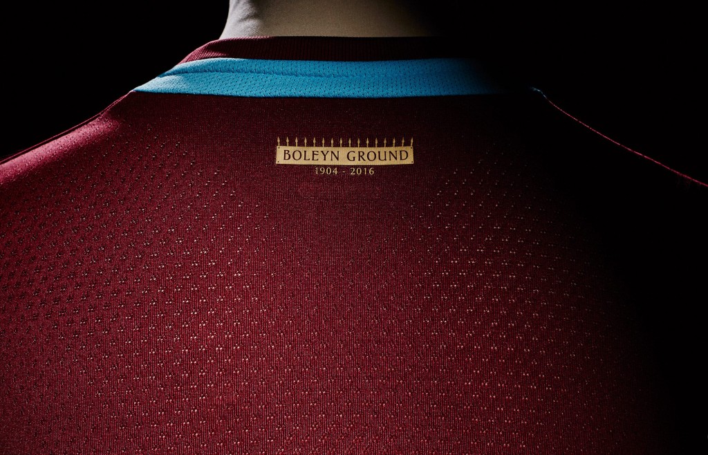 La nuova maglia Umbro del West Ham è caratterizzata da uno stile classico, nel quale i colori claret & blue rispettano la tradizione del club. Il busto è interamente granata, con maniche e il girocollo azzurri. Il logo Umbro è ricamato in color oro, lo stesso scelto per i dettagli dello stemma societario sul cuore e la scritta “The Boleyn Ground 1904-2016” apposta sotto a quest’ultimo. Sulla schiena, appena sotto il collo, troviamo un disegno stilizzato e la dicitura “Boleyn Ground”. Completano la divisa di casa i pantaloncini rigorosamente bianchi con dettagli granata e calzettoni dello stesso colore, con un inserto orizzontale azzurro e marchio Umbro oro.